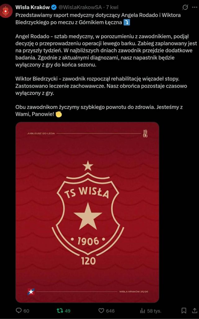To już oficjalne – Ángel Rodado nie zagra do końca sezonu. Hiszpan podda się operacji barku, z którym ma problemy od dłuższego czasu. Kiedy zaczęły się kłopoty zdrowotne? Jak Wisła poradzi sobie bez swojego najlepszego strzelca? Jakie warianty do dyspozycji ma trener Jop?